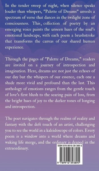 In the tender sweep of night, when silence speaks louder than whispers, "Palette of Dreams" unveils a spectrum of verse that dances in the twilight zone of consciousness. This collection of poetry by an emerging voice paints the unseen hues of the soul's emotional landscape, with each poem a brushstroke that transforms the canvas of our shared human experience. Through the pages of "Palette of Dreams," readers are invited on a journey of introspection and imagination. Here, dreams are not just the echoes of our day but the whispers of our essence, each one a shade more vivid and profound than the last. This anthology of emotions ranges from the gentle touch of love's first blush to the searing pain of loss, from the bright hues of joy to the darker tones of longing and introspection. The poet navigates through the realms of reality and fantasy with the deft touch of an artist, challenging you to see the world in a kaleidoscope of colors. Every poem is a window into a world where dreams and waking life merge, and the ordinary is draped in the extraordinary. © 2023 Book Fairy Publishing