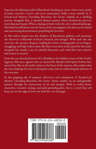 Step into the alluring world of Barcelona's bustling art scene, where every stroke of paint conceals a secret, and every masterpiece holds a story untold. In 'A Female-Led Mystery Unveiling Barcelona Art Scene,' embark on a thrilling journey alongside Mia, a talented abstract painter whose brushwork uncovers more than just beauty. When a daring art heist rocks the city's cultural landscape, Mia finds herself thrust into the heart of the investigation, her keen eye for detail and unwavering determination propelling her forward. As Mia delves deeper into the shadows of Barcelona's galleries and museums, she discovers a labyrinth of deceit, betrayal, and intrigue. With each clue she uncovers, the mystery deepens, leading her down twisting paths of art forgery, smuggling, and high-stakes crime. But Mia is not alone in her quest for the truth; alongside her stands a cast of colorful characters, each with their own motives and secrets to unravel. From the sun-drenched streets of La Rambla to the hidden corners of the Gothic Quarter, Mia races against time to unravel the threads of deception before they unravel her. But as she inches closer to the heart of the mystery, Mia realizes that the true challenge lies not in solving the crime, but in confronting the demons of her own past. In this gripping tale of suspense, discovery, and redemption, 'A Female-Led Mystery Unveiling Barcelona Art Scene' invites readers on an unforgettable journey through the intersection of art and intrigue. With its richly drawn characters, evocative setting, and pulse-pounding plot, this is a novel that will keep you on the edge of your seat until the very last page