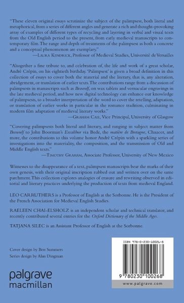 "These eleven original essays scrutinize the subject of the palimpsest, both literal and metaphorical, from a series of different angles and generate a rich and thought-provoking array of examples of different types of recycling and layering in verbal and visual texts from the Old English period to the present, from early medieval manuscripts to contemporary film. The range and depth of treatments of the palimpsest as both a concrete and a conceptual phenomenon are exemplary." - Laura Kendrick, Professor of Medieval Studies, Université de Versailles