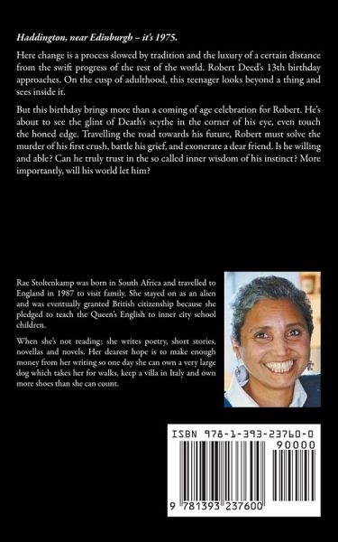 Haddington, near Edinburgh - it's 1975. Here change is a process slowed by tradition and the luxury of a certain distance from the swift progress of the rest of the world. Robert Deed's 13th birthday approaches. On the cusp of adulthood, this teenager looks beyond a thing and sees inside it. But this birthday brings more than a coming of age celebration for Robert. He's about to see the glint of Death's scythe in the corner of his eye, even touch the honed edge. Travelling the road towards his future, Robert must solve the murder of his first crush, battle his grief, and exonerate a dear friend. Is he willing and able? Can he truly trust in the so called inner wisdom of his instinct? More importantly, will his world let him?