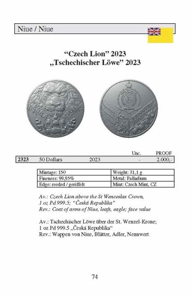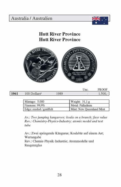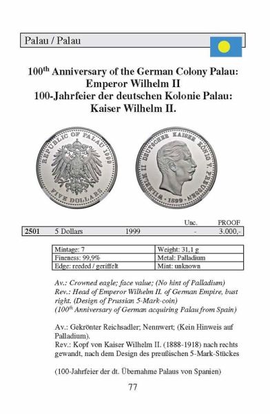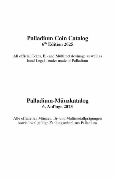 Gold- und Silbermünzen dürften allen Münzsammler bekannt und vertraut sein, da sie seit Jahrtausenden geprägt werden. Aber erst seit knapp 60 Jahren wird das Edelmetall "Palladium" zur Prägung von Münzen verwendet. In diesem für die Münzgeschichte sehr kurzen Zeitraum wurden mittlerweile 153 verschiedene Palladiummünzen geprägt. Da die Auflage der meisten Münzen sehr niedrig und das Sammelgebiet mit den wenigen Prägungen überschaubar ist, erfreuen sich die Münzen in exklusiven Sammlerkreisen großer Beliebtheit und werden als Geldanlage neben Gold, Silber und Platin verwendet. Der "Palladium-Münzkatalog" enthält neben allen geprägten Palladium münzen auch Bi-, Tri- und Multimetallmünzen mit Palladiumanteilen sowie lokal gültige Zahlungsmittel aus Palladium mit einer Mindestauflage von 5 Exemplaren und bewertet diese zu den aktuellen Marktpreisen in EURO. Ein Vorwort über die Preisentwicklung des Edelmetalls seit Anfang der 1990er-Jahre sowie ein Überblick über die Herkunft und Verwendung von Palladium runden den Katalog, der bilingual (eng./dt.) gestaltet ist, ab.