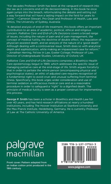 "A detailed analysis of end-of-life treatment, this book offers an important contribution to an area of academic, political, ethical and religious concern. Palliative Care and End-of-Life Decisions covers a broad range of issues, including the nature of pain and of pain management, the concept of medical futility, the doctrine of double effect, the regulation of physician-assisted death, and an analysis of the nature of a 'good death'. Although dealing with a controversial issue, Smith does so with analytical depth and sophistication, while making an impassioned case for reform." - Jonathan Herring, Fellow in Law, Exeter College; Professor of Law, Director of Undergraduate Studies, University of Oxford, UK