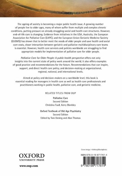 Current projections indicate that by 2050 the number of people aged over 80 years old will rise to 395 million and that by this date 25-30% of people over the age of 85 will show some degree of cognitive decline. Palliative care for older people: A public health perspective provides a comprehensive account of the current state of palliative care for older people worldwide and illustrates the range of concomitant issues that, as the global population ages, will ever more acutely shape the decisions of policy-makers and care-givers. The book begins by outlining the range of policies towards palliative care for older people that are found worldwide. It follows this by examining an array of socio-cultural issues and palliative care initiatives, from the care implications of health trajectories of older people to the spiritual requirements of palliative care patients, and from the need to encourage compassion towards end-of-life care within communities to the development of care pathways for older people. Palliative care for older people: A public health perspective is a valuable resource for professionals and academics in a range of healthcare and public health fields to understand the current state of policy work from around the world. The book also highlights the social-cultural considerations that influence the difficult decisions that those involved in palliative care face, not least patients themselves, and offers examples of good practice and recommendations to inspire, support, and direct healthcare policy and decision-making at organisational, regional, national and international levels.