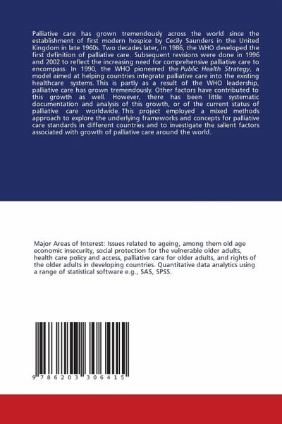 Palliative care has grown tremendously across the world since the establishment of first modern hospice by Cecily Saunders in the United Kingdom in late 1960s. Two decades later, in 1986, the WHO developed the first definition of palliative care. Subsequent revisions were done in 1996 and 2002 to reflect the increasing need for comprehensive palliative care to encompass. In 1990, the WHO pioneered the Public Health Strategy, a model aimed at helping countries integrate palliative care into the existing healthcare systems. This is partly as a result of the WHO leadership, palliative care has grown tremendously. Other factors have contributed to this growth as well. However, there has been little systematic documentation and analysis of this growth, or of the current status of palliative care worldwide. This project employed a mixed methods approach to explore the underlying frameworks and concepts for palliative care standards in different countries and to investigate the salient factors associated with growth of palliative care around the world.