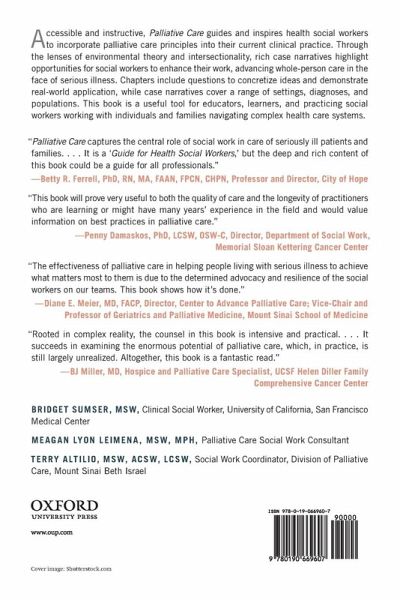 * Foreword * Introduction: In Plain Sight * 1: Colleen M. Mulkerin: The Convergence of Social Work Practice: Integrating Health Social Work and Specialized Palliative Care * 2: Anne Kelemen and Regina Tosca: Structure and Processes of Care * 3: Terry Altilio and Meagan Lyon Leimena: Physical Aspects of Care * 4: Christopher Onderdonk and Kathryn Thornberry: Psychological Aspects of Care * 5: Karra Bikson: Social Aspects of Care * 6: Dana Ribeiro Miller, Melissa Stewart, and Bridget Sumser: Spiritual, Religious, and Existential Dimensions of Care * 7: Yvette Colón: Cultural Aspects of Care * 8: Susan Conceicao and Ginny Swenson: Care of Patients and Families at the End of Life * 9: Kathryn M. Smolinski: Legal and Ethical Aspects of Care * 10: Terry Altilio, Meagan Lyon Leimena, Bridget Sumser, Allie Shukraft, Martha Schermer, Mercedes Bern- Klug, and Amy L. Lemke : Special Issues in Children and Older Adults * Epilogue * Appendix: * Patient Narratives * General Resources * Technical Reports and Issue Briefs * Timeline of Seminal Publications, Decisions, and Events * Training Opportunities * Domestic Resources and Organizations * International Resources and Organizations * Hospice Eligibility and Benefits Information * Multimedia * Additional Reading * Index