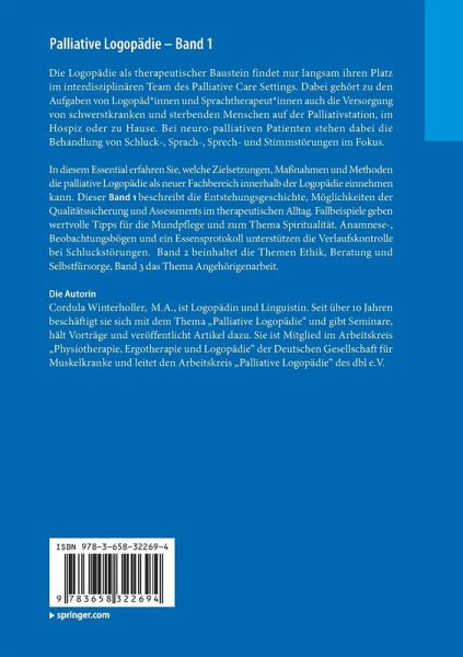 In diesem Essential erfahren Sie, welche Zielsetzungen, Maßnahmen und Methoden die palliative Logopädie als neuer Fachbereich innerhalb der Logopädie einnehmen kann. Dieser Band 1 beschreibt die Entstehungsgeschichte, Möglichkeiten der Qualitätssicherung und Assessments im therapeutischen Alltag. Fallbeispiele geben wertvolle Tipps für die Mundpflege und zum Thema Spiritualität. Anamnese-, Beobachtungsbögen und ein Essensprotokoll unterstützen die Verlaufskontrolle bei Schluckstörungen. Band 2 beinhaltet die ThemenEthik, Beratung und Selbstfürsorge, Band 3 das Thema Angehörigenarbeit.