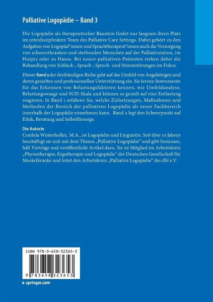 Dieser Band 3 der dreibändigen Reihe geht auf das Umfeld von Angehörigen und deren gezielten und professionellen Unterstützung ein. Sie lernen Instrumente für das Erkennen von Belastungsfaktoren kennen, wie Umfeldanalyse, Belastungswaage und SUD-Skala und können so gezielt auf eine Entlastung reagieren. In Band 1 erfahren Sie, welche Zielsetzungen, Maßnahmen und Methoden der Bereich der palliativen Logopädie als neuer Fachbereich innerhalb der Logopädie einnehmen kann. Band 2 legt den Schwerpunkt auf Ethik, Beratung und Selbstfürsorge.
