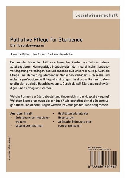 Fachbuch aus dem Jahr 2013 im Fachbereich Sozialwissenschaften allgemein, , Sprache: Deutsch, Abstract: Den meisten Menschen fällt es schwer, das Sterben als Teil des Lebens zu akzeptieren. Mannigfaltige Möglichkeiten der medizinischen Lebensverlängerung verdrängen das Lebensende aus unserem Alltag. Auch die Pflege und Begleitung sterbender Menschen verlagert sich mehr und mehr in professionelle Pflegeeinrichtungen. In diesem Rahmen entwickelte sich auch die Hospizbewegung. Durch sie soll Sterbenden ein würdiges Ende ermöglicht werden.Welche Formen der Sterbebegleitung finden sich in der Hospizbewegung? Welchen Standards muss sie genügen? Wie gestaltet sich die Bedarfslage? Diese und andere Fragen werden im vorliegenden Band besprochen.Aus dem Inhalt: Entstehung der Hospizbewegung, Organisationsformen, Qualitätsmerkmale der Hospizarbeit, Adäquate Betreuung sterbender Menschen.