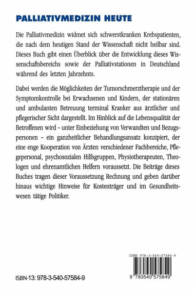 Die Palliativmedizin widmet sich schwerstkranken, nach heutigem Stand der Wissenschaft unheilbaren Krebspatienten. Das Buch gibt einen Überblick über die Entwicklung dieses wichtigen Wissenschaftsbereichs sowie der Palliativstationen in Deutschland während des letzten Jahrzehnts. Besprochen werden die Möglichkeiten der Tumorschmerztherapie sowie Symptomkontrolle und Pflege bei Erwachsenen und Kindern. Die Bedeutung der engen Kooperation von Ärzten, Pflegepersonal, psychosozialen Hilfsgruppen, Physiotherapeuten, Theologen und ehrenamtlichen Helfern/Angehörigen im Sinne einer ganzheitlichen Behandlung wird aufgezeigt und anhand eines entsprechenden Konzeptes dargestellt. Die Beiträge geben darüber hinaus wichtige Hinweise für Kostenträger und für im Gesundheitswesen tätige Politiker.