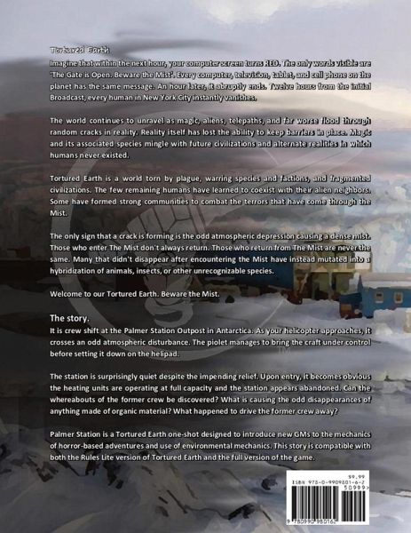 You are part of a relief crew flying out to Plamer Station, Antarctica when an odd atmospheric disturbance nearly crashes your helicopter. Upon arriving at the remote station, all is quiet: radios are silent, heaters are set at maximum, and the station is empty. What happened to the previous crew? How are the odd occurrences and new creatures logged connected to what has happened to the station? Palmer Station is a Tortured Earth adventure modified to either run with the expanded rule set or the free-to-play download available at www.torturedearth.com.