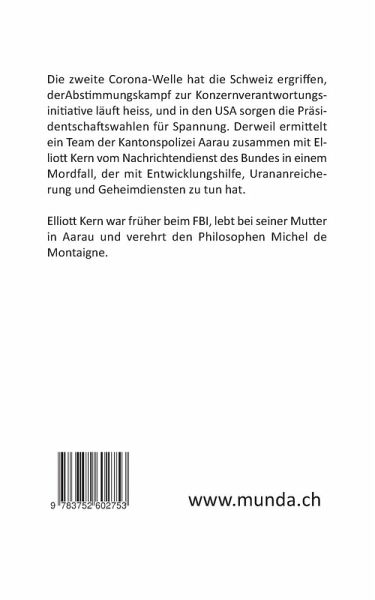 Ein Geschäftsmann aus Lenzburg beantragt eine Exportbewilligung für Maschinen, die für die Palmölproduktion in Indonesien bestimmt sind. Diese Maschinen könnten jedoch auch für die Urananreicherung eingesetzt werden. Elliott Kern vom Nachrichtendienst des Bundes wird beauftragt, den Sachverhalt zu prüfen. Dabei gerät er in eine Mordermittlung der Aargauer Kantonspolizei.Die Ermittlungen finden statt, während die zweite Corona-Welle die Schweiz erreicht hat, im Stimmvolk um die Konzernverantwortungsinitiative gekämpft wird und in den USA spannende Präsidentschaftswahlen stattfinden. Elliott Kern war früher beim FBI, lebt bei seiner Mutter und verehrt den Philosophen Michel de Montaigne.