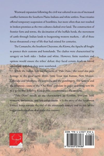 Westward expansion following the civil war ushered in an era of increased conflict between the Southern Plains Indians and white settlers. Peace treaties offered temporary suspension of hostilities, but more often than not resulted in broken promises as the two cultures clashed over land. The construction of frontier forts and towns, the decimation of the buffalo herds, the movement of cattle through Indian lands to burgeoning western markets, - all of these forces threatened a way of life that had existed for centuries. The Comanche, the Southern Cheyenne, the Kiowa, the Apache all fought to protect their customs and homelands. The clashes were characterized by savagery on both sides - Indian and white. However, finite numbers and options would ensure the tribes' defeat; they faced certain death or forced relocation, and their days were numbered. While the Indian wars are the focus of "Palo Duro," the novel also pays homage to the great cattle drives from Texas into Kansas, New Mexico, Colorado and Montana, the cowboys, and the gunslingers. The famous and the infamous -icons of the "Old West" populate its pages and bring new life to a genre that is fading from public consciousness - the western. "Palo Duro" recalls an era characterized by heroism, brutality, bold ventures, lawlessness, and law enforcement. It is the story of the Southwest United States towards the end of the nineteenth century and an ode to the rugged individualism that made this country.
