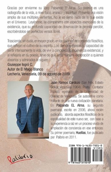 Gracias por enviarme su libro Palpando El Alma. Su poesía es una radiografía de la vida, a nivel físico, anímico y espiritual. Presenta una visión amplia de sus múltiples vertientes. No le es ajeno nada de lo que existe en el Universo. Leyéndole, se compenetra con aspectos esenciales de la existencia, que su profunda capacidad de observación le permite percibir, escribiéndolos en perfectos versos libres. Trasciende, sin duda, en mayor grado, en los poemas de contenido filosófico, que reflejan el cultivo de su espíritu. Los demás expresan su capacidad de sentir intensamente la vida, de vivir a conciencia la experiencia existencial, y al reflejarla en su poesía, sirve de guía en la humana exploración a quienes absortos y admirados le siguen. Giuseppe Isgró C. Autor de El Mago Blanco Lechería, Venezuela, 09 de agosto de 2009.