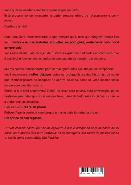 Você quer se excitar e dar todo o prazer que merece? Está procurando um momento verdadeiramente íntimo de relaxamento e bem-estar? Então continue lendo! Com este livro, você terá tudo o que sempre quis e que ninguém nunca lhe deu: muitas e muitas histórias explícitas em português, exatamente como você sempre quis! Você tem diante de si uma coleção de histórias explícitas dedicadas ao bom sexo que é possível entre homens e mulheres que gostam de agradar um ao outro. Muitos contos excitantes para experimentar sozinho ou acompanhado. Você encontrará muitos diálogos entre os protagonistas das histórias, de modo que também poderá se imaginar no centro da cena, como se você mesmo fosse um personagem da história. Então, o que está esperando? Deixe-se levar pela paixão, pela provocação, pelas fantasias proibidas que você sempre teve, deixe de lado suas inibições e comece a viajar com as emoções. Sem censura, 100% de prazer. Relaxe, fique à vontade e embarque em uma bela jornada de prazer. Um brinde ao seu orgasmo!
