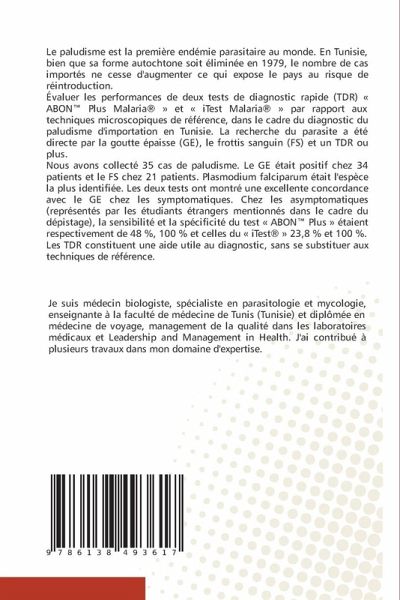 Le paludisme est la première endémie parasitaire au monde. En Tunisie, bien que sa forme autochtone soit éliminée en 1979, le nombre de cas importés ne cesse d'augmenter ce qui expose le pays au risque de réintroduction. Évaluer les performances de deux tests de diagnostic rapide (TDR) « ABON(TM) Plus Malaria® » et « iTest Malaria® » par rapport aux techniques microscopiques de référence, dans le cadre du diagnostic du paludisme d'importation en Tunisie. La recherche du parasite a été directe par la goutte épaisse (GE), le frottis sanguin (FS) et un TDR ou plus. Nous avons collecté 35 cas de paludisme. Le GE était positif chez 34 patients et le FS chez 21 patients. Plasmodium falciparum était l'espèce la plus identifiée. Les deux tests ont montré une excellente concordance avec le GE chez les symptomatiques. Chez les asymptomatiques (représentés par les étudiants étrangers mentionnés dans le cadre du dépistage), la sensibilité et la spécificité du test « ABON(TM) Plus » étaient respectivement de 48 %, 100 % et celles du « iTest® » 23,8 % et 100 %. Les TDR constituent une aide utile au diagnostic, sans se substituer aux techniques de référence.