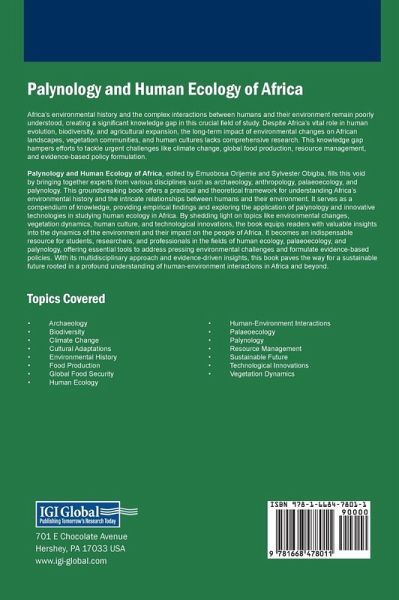 Africa's environmental history and the complex interactions between humans and their environment remain poorly understood, creating a significant knowledge gap in this crucial field of study. Despite Africa's vital role in human evolution, biodiversity, and agricultural expansion, the long-term impact of environmental changes on African landscapes, vegetation communities, and human cultures lacks comprehensive research. This knowledge gap hampers efforts to tackle urgent challenges like climate change, global food production, resource management, and evidence-based policy formulation. Palynology and Human Ecology of Africa , edited by Emuobosa Orijemie and Sylvester Obigba, fills this void by bringing together experts from various disciplines such as archaeology, anthropology, palaeoecology, and palynology. This groundbreaking book offers a practical and theoretical framework for understanding Africa's environmental history and the intricate relationships between humans and their environment. It serves as a compendium of knowledge, providing empirical findings and exploring the application of palynology and innovative technologies in studying human ecology in Africa. By shedding light on topics like environmental changes, vegetation dynamics, human culture, and technological innovations, the book equips readers with valuable insights into the dynamics of the environment and their impact on the people of Africa. It becomes an indispensable resource for students, researchers, and professionals in the fields of human ecology, palaeoecology, and palynology, offering essential tools to address pressing environmental challenges and formulate evidence-based policies. With its multidisciplinary approach and evidence-driven insights, this book paves the way for a sustainable future rooted in a profound understanding of human-environment interactions in Africa and beyond.