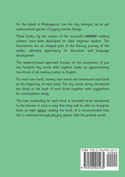 These books are set on the island of Madagascar where the endogos live, an as yet undiscovered species of pygmy human beings. These books, by the creator of the successful weebee reading scheme for very young beginners, have been designed for older beginner readers. The illustrations are an integral part of the literacy journey of the reader, allowing opportunity for discussion and language development. The research-based approach focuses on the recognition of just one hundred key words that together make up approximately two-thirds of all reading matter in English. For each new book, twenty new words are introduced and listed at the beginning of each book. The key words being introduced are listed at the back of each book together with suggestions for word-pattern study. There are currently eight books in the first series of the endogo books. By the end of this series, the reader will know more than the thirty-six words that make up one third of all reading matter in English written narrative. The UK National Literacy Trust has stated that there is "overwhelming evidence that literacy has a significant relationship with a person's happiness and success," (Literacy Changes Lives: An Advocacy Resource, 2008). Low literacy rates are associated with higher rates of crime, the cycle of poverty, and dependence on welfare. In the UK in 2024 eighty-five percent of juveniles who interacted with the courts were functionally illiterate. According to the National Literacy Trust report in 2024, sixteen percent of adults in England are functionally illiterate. The endogo books have been created to appeal to older beginner readers and those who are functionally illiterate.