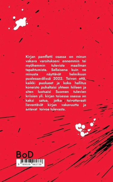 Kirjan pamfletti osassa on minun vakava varoitukseni ennemmin tai myöhemmin tulevista maailman tapahtumista. Sellaisena kuin ne minusta näyttävät helmikuun puolessavälissä 2022. Toivon että, kaikki puolueet ja koko hallitus koneisto puhaltaisi yhteen hiileen ja siten luotsaisi Suomen tulevien kriisien yli. kirjan toisessa osassa on kaksi satua, jotka toivottavasti lieventävät kirjan vakavuutta ja antavat toivoa tulevasta.