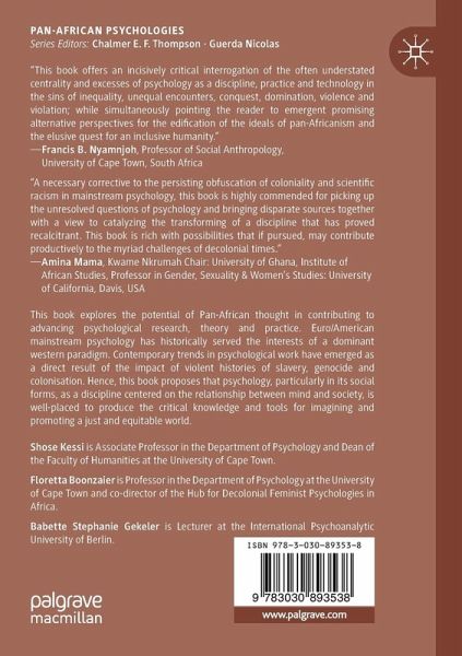 Chapter 1 Pan-Africanism and Psychology Resistance, liberation and decoloniality.- Chapter 2 Pan-Africanism Histories, synergies and contradictions.- Chapter 3 National identity, xenophobic violence and Pan-African psychology.- Chapter 4 African feminisms, Pan-Africanism and psychology.- Chapter 5 Institutional racism and the university in Africa: A focus on South Africa.- Chapter 6 Methodologies, ethics and critical reflexive practices for a Pan-African psychology.- Chapter 7 Towards a Pan-African psychology of restorative and reparatory justice.- Chapter 8 Concluding remarks: Can a Pan-African psychology address the wounds of slavery, colonization, and apartheid?.