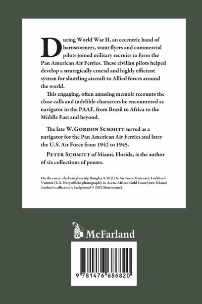 During World War II, an eccentric band of barnstormers, stunt flyers and commercial pilots joined military recruits to form the Pan American Air Ferries. These civilian pilots helped develop a strategically crucial and highly efficient system for shuttling aircraft to Allied forces around the world that contributed significantly to key campaigns throughout the war. W. Gordon Schmitt's engaging, often amusing memoir recounts the close calls and indelible characters he encountered as navigator in the PAAF, from Brazil to Africa to the Middle East and beyond.