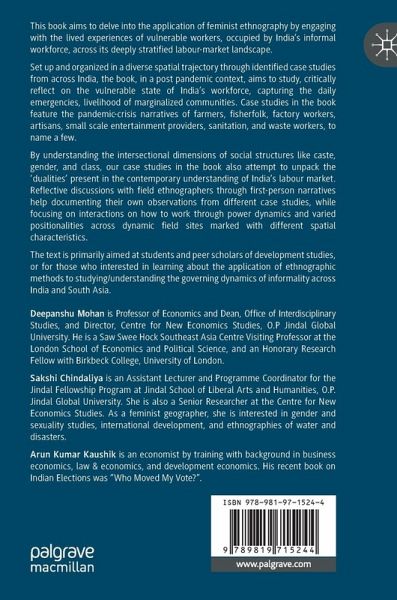 This book aims to delve into the application of feminist ethnography by engaging with the lived experiences of vulnerable workers, occupied by India's informal workforce, across its deeply stratified labour-market landscape.