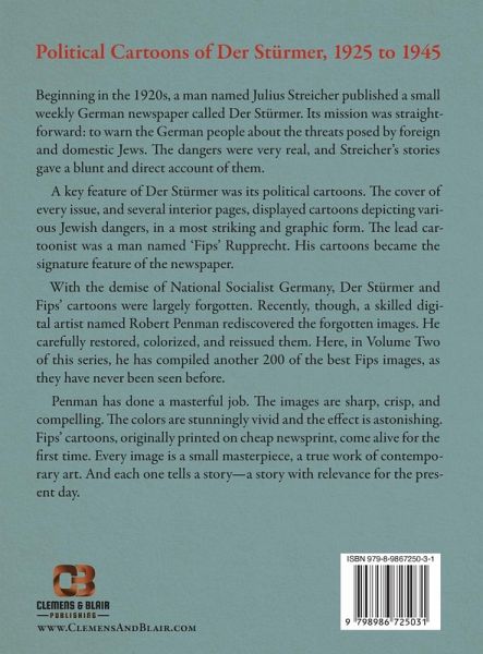 Beginning in the 1920s, a man named Julius Streicher published a small weekly German newspaper called Der Stürmer. Its mission was straightforward: to warn the German people about the threats posed by foreign and domestic Jews. The dangers were very real, and Streicher's stories gave a blunt and direct account of them. A key feature of Der Stürmer was its political cartoons. The cover of every issue, and several interior pages, displayed cartoons depicting various Jewish dangers, in a most striking and graphic form. The lead cartoonist was a man named 'Fips' Rupprecht. His cartoons became the signature feature of the newspaper, and grew to represent the broader German struggle against Jewry. With the demise of National Socialist Germany, Der Stürmer and Fips' cartoons were largely forgotten. Or rather, they were buried-the victorious nations certainly did not want old Nazi images floating around, raising difficult questions and making people think. Recently, though, a skilled digital artist named Robert Penman rediscovered the forgotten images. He carefully restored, colorized, and reissued them. Here, in volume two of this series, Penman has produced another 200 of the best Fips images, as they have never been seen before. Penman has done a masterful job. The images are sharp, crisp, and compelling. The colors are stunningly vivid. The effect is truly astonishing. Fips' cartoons, originally printed on cheap newsprint, come alive for the first time. Every image is a small masterpiece, a true work of contemporary art. And one each tells a story-a story with relevance for the present day. Volume two is organized thematically, with 11 chapters covering such topics as "blood libel", "morality and immorality", "media and press", and "the USA". The book closes with chapters on assorted Fips images, the non-Fips work "A Good Frenchman", and various non-Stürmer cartoons. All in all, another fascinating and compelling collection of cartoons.