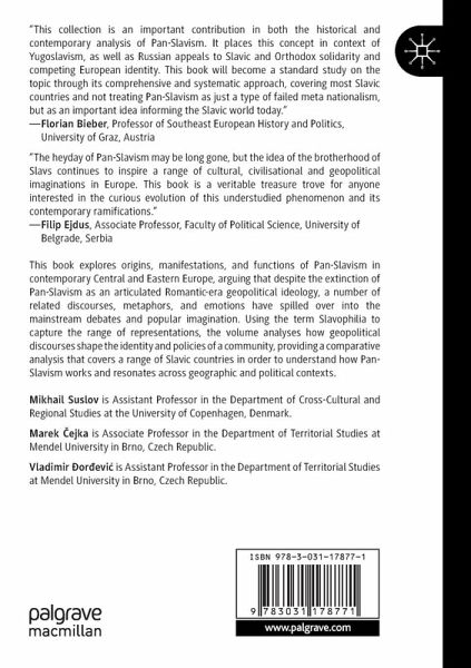 Chapter 1. Introduction - Examining Pan-Slavism: Conceptual Approach, Methodological Framework, and State of the Art.- Chaper 2. Structure of the Volume.- Section I: Pan-Slavism as History.- Chapter 3. Russian Pan-Slavism: A Historical Perspective.- Chaper 4. A Short History of Pan-Slavism and its Impact on Central Europe in the Nineteenth and Twentieth Centuries.- Chapter 5. Pan-Slavism in the Balkans: A Historical View.- Section II: Pan-Slavism as a (Political) Tool.- Chapter 6. New Wine in an Old Wineskin: Slavophilia and Geopolitical Populism in Putin's Russia.- Chapter 7. Ideational Travels of Slavophilia in Belarus: From Tsars to Lukashenka.- Chapter 8. On Pan-Slavism, Brotherhood, and Mythology: The Imagery of Contemporary Geopolitical Discourse in Serbia.- Chapter 9. Intermarium or Hyperborea? Pan-Slavism in Poland after 1989.- Section III: On Pan-Slavism, Identity, and Other Issues.- Chapter 10. A Distant Acquaintance: Reflecting on Croatia's Relationship with Pan-Slavism.- Chapter 11. On Pan-Slavism(s) and Macedonian National Identity.- Chapter 12. Invented 'Europeanness' versus Residual Slavophilism: Ukraine as an Ideological Battlefield.- Section IV: On Pan-Slavism, East vs. West Divide, and Orthodoxy.- Chapter 13. Bulgaria's Backlash against the Istanbul Convention: Slavophilia as the Historical Frame of Pseudo-Religious Illiberalism.- Chapter 14. Montenegrin Squaring of the Circle: Between Russophilia, Pan-Orthodoxia, and Competing Nationalism.- Chapter 15. Pan-Slavism and Slavophilia in the Czech Republic within the Context of Hybrid Threats.- Chapter 16. Slovakia: Emergence of an Old-New Pseudo-Pan-Slavism in the Context of the Conflict between Russia and Ukraine after 2014.- Section V: An Ethnographic Look on Pan-Slavism.- Chapter 17. Manifestations of Pan-Slavic Sentiments among South Slavic Diaspora Communities in the United States of America.- Chapter 18. Interethnic Ritual Kinship as Pan-Slavism in Bosnia and Herzegovina.