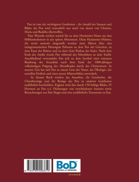 Pan ist eine der wichtigsten Gottheiten - die Anzahl der Statuen und Bilder des Pan wird vermutlich nur noch von denen von Christus, Maria und Buddha übertroffen. Pans Wurzeln reichen zurück bis zu dem Herdentier-Mann aus den Höhlenmalereien in der späten Altsteinzeit. Diese Herdentier-Männer, die meist tanzend dargestellt worden sind, führen über den indogermanischen Hirtengott Pehuson zu dem Pan der Griechen, zu dem Faun der Römer und zu dem Gott Pushan der Inder. Nach dem Ende der Antike wurde Pan während des Mittelalters zu dem Teufel. Anschließend verwandelte Pan sich zu dem Symbol einer erneuten Bejahung der Sexualität nach dem Ende der 1000-jährigen vollständigen Prägung des Abendlandes durch das Christentum. In neuerer Zeit hat sich Pan zu einem Gott der Natur, der Ökologie, der sexuellen Freiheit und eines neuen Männerbildes entwickelt. In diesem Buch werden das Aussehen, die Geschichte, die Charakterzüge und die Bezüge des Pan zu anderen Gottheiten ausführlich beschrieben. Ergänzt wird dies durch 150 farbige Bilder, 35 Hymnen an Pan u.ä. Dichtungen sowie Betrachtungen zur Pan-Magie und eine ausführliche Traumreise zu Pan.