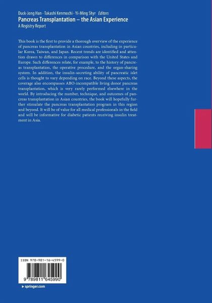 This book is the first to provide a thorough overview of the experience of pancreas transplantation in Asian countries, including in particular Korea, Taiwan, and Japan. Recent trends are identified and attention drawn to differences in comparison with the United States and Europe. Such differences relate, for example, to the history of pancreas transplantation, the operative procedure, and the organ-sharing system. In addition, the insulin-secreting ability of pancreatic islet cells is thought to vary depending on race. Beyond these aspects, the coverage also encompasses ABO-incompatible living donor pancreas transplantation, which is very rarely performed elsewhere in the world. By introducing the number, technique, and outcomes of pancreas transplantation in Asian countries, the book will hopefully further stimulate the pancreas transplantation program in this region and beyond. It will be of value for all medical professionals in the field and will be informative for diabetic patients receiving insulin treatment in Asia.