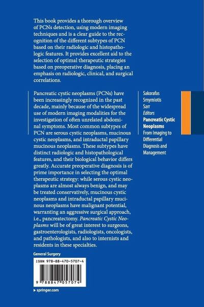 Pancreatic cystic neoplasms (PCNs) have been increasingly recognized during the past decade, mainly because of the widespread use of modern imaging modalities for the investigation of often unrelated abdominal symptoms. The three most common subtypes of PCN are serous cystic neoplasms, mucinous cystic neoplasms, and intraductal papillary mucinous neoplasms. These subtypes have distinct radiologic and histopathological features, and their biological behavior differs greatly. Accurate preoperative diagnosis is of prime importance in selecting the optimal therapeutic strategy: while serous cystic neoplasms are almost always benign, and may be treated conservatively, mucinous cystic neoplasms and intraductal papillary mucinous neoplasms have malignant potential, warranting an aggressive surgical approach, i.e., pancreatectomy. Pancreatic Cystic Neoplasms will be of great interest to surgeons, gastroenterologists, radiologists, oncologists, and pathologists, and also to internists and residents in these specialties.