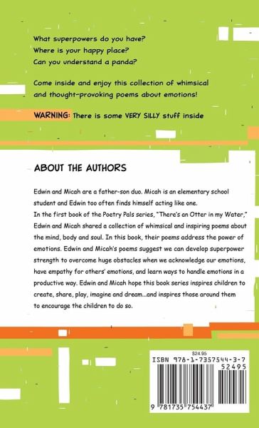 In this 2nd book of the Poetry Pals series, Edwin and his son share a diverse collection of whimsical and thought-provoking poems about emotions. Micah is an elementary school student and Edwin too often finds himself acting like one. In the first book of the Poetry Pals series, "There's an Otter in my Water," Edwin and Micah shared a collection of whimsical and inspiring poems about the mind, body and soul. In this book, their poems address the power of emotions. Edwin and Micah's poems suggest we can develop super power strength to overcome huge obstacles when we acknowledge our emotions, have empathy for others' emotions, and learn ways to handle emotions in a productive way. For young children, there are playful poems with vivid illustrations that will make you laugh together and inspire a creative imagination. - What if everyday is pajama day? - Why don't we like broccoli? - What if a bear came for lunch? For older children, there are educational poems which teach ways to handle emotions. - Is it okay to let me fall? - Can I be a bridge to connect to others? - What is courage? For adults, there are inspirational poems for reading and discussing with the little ones. - What does it mean to be authentic? - What superpowers do little ones have? - Why do we shed tears? Edwin and Micah hope this book series inspires children to create, share, play, imagine and dream. WARNING: There is some VERY SILLY stuff inside For Poetry Pals merchandise, visit edwinpadlan.com