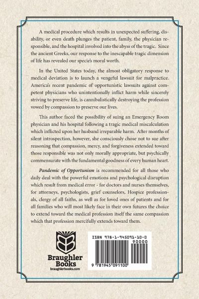 Pandemic of Opportunism is recommended for all those who daily deal with the powerful emotions and psychological disruption which result from medical error - for doctors and nurses themselves, for attorneys, psychologists, grief counselors, Hospice professionals, clergy of all faiths, as well as for loved ones of patients and for all families who will most likely face in their own futures the choice to extend toward the medical profession itself the same compassion which that profession mercifully extends toward them.