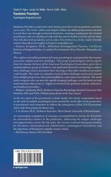 Chapter 1. In the Beginning.- Chapter 2. Lessons Learned from the 1918 "Forgotten Flu".- Chapter 3. Interpersonal Violence During COVID .- Chapter 4. Parenting During a Pandemic.- Chapter 5. Vibrant Older Adults .- Chapter 6. The Hospital, Health and Addiction Workers, Patients and Families.- Chapter 7. Supporting Mental Health Clinicians During the Pandemic .- Chapter 8. International Somatic and Creative Arts Whole Person .- Chapter 9. International Student Collaborations on COVID-19 .- Chapter 10. Telepsychology and Digital Therapeutics.- Chapter 11. International Advancements on Covid-19 Scholarship through the Research Initiatives .- Chapter 12. Toward the Practice of Pandemic Patience and Persistence.