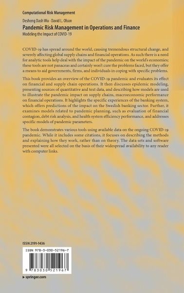 COVID-19 has spread around the world, causing tremendous structural change, and severely affecting global supply chains and financial operations. As such there is a need for analytic tools help deal with the impact of the pandemic on the world's economies; these tools are not panaceas and certainly won't cure the problems faced, but they offer a means to aid governments, firms, and individuals in coping with specific problems. This book provides an overview of the COVID-19 pandemic and evaluates its effect on financial and supply chain operations. It then discusses epidemic modeling, presenting sources of quantitative and text data, and describing how models are used to illustrate the pandemic impact on supply chains, macroeconomic performance on financial operations. It highlights the specific experiences of the banking system, which offers predictions of the impact on the Swedish banking sector. Further, it examines models related to pandemic planning, such as evaluation of financial contagion, debt risk analysis, and health system efficiency performance, and addresses specific models of pandemic parameters. The book demonstrates various tools using available data on the ongoing COVID-19 pandemic. While it includes some citations, it focuses on describing the methods and explaining how they work, rather than on theory. The data sets and software presented were all selected on the basis of their widespread availability to any reader with computer links.