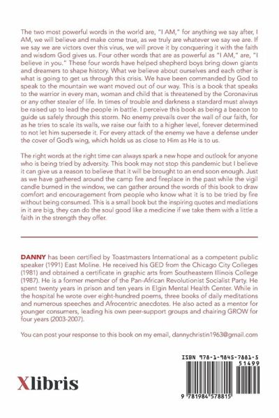 The two most powerful words in the world are, "I AM," for anything we say after, I AM, we will believe and make come true, as we truly are whatever we say we are. If we say we are victors over this virus, we will prove it by conquering it with the faith and wisdom God gives us. Four other words that are as powerful as "I AM," are, "I believe in you." These four words have helped shepherd boys bring down giants and dreamers to shape history. What we believe about ourselves and each other is what is going to get us through this crisis. We have been commanded by God to speak to the mountain we want moved out of our way. This is a book that speaks to the warrior in every man, woman and child that is threatened by the Coronavirus or any other stealer of life. In times of trouble and darkness a standard must always be raised up to lead the people in battle. I perceive this book as being a beacon to guide us safely through this storm. No enemy prevails over the wall of our faith, for as he tries to scale its walls, we raise our faith to a higher level, forever determined to not let him supersede it. For every attack of the enemy we have a defense under the cover of God's wing, which holds us as close to Him as He is to us. The right words at the right time can always spark a new hope and outlook for anyone who is being tried by adversity. This book may not stop this pandemic but I believe it can give us a reason to believe that it will be brought to an end soon enough. Just as we have gathered around the camp fire and fireplace in the past while the vigil candle burned in the window, we can gather around the words of this book to draw comfort and encouragement from people who know what it is to be tried by fire without being consumed. This is a small book but the inspiring quotes and mediations in it are big, they can do the soul good like a medicine if we take them with a little a faith in the strength they offer.