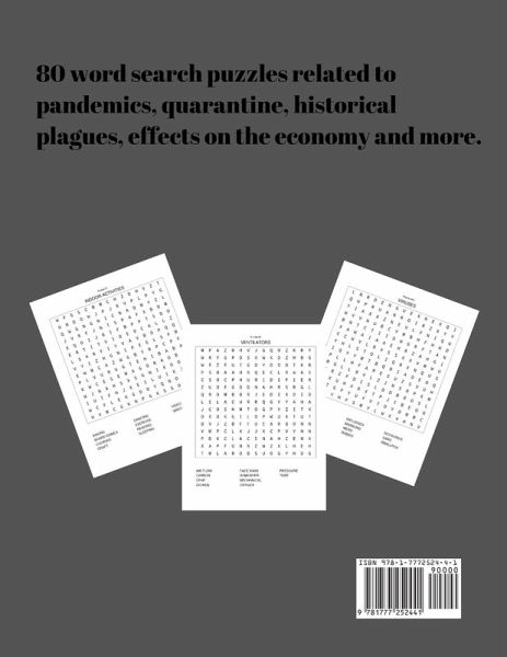 Pandemic themed word search puzzle book 80 word search puzzles related to pandemics, quarantine, historical plagues, effects on the economy and more. For ease of use, each puzzle is listed on its own page. Large print lettering has been used throughout the book. As a result, this puzzle book can also be enjoyed by seniors or people with eyesight issues. Makes a wonderful gift for word search fans who are interested in diseases from the past and the effect of the current pandemic on our world. Exercise your mind and build your vocabulary with a variety of regular words along with medical terminology. Features:80 pandemic related word search puzzles Soft, matte cover Paperback Spacious 8.5" x 11" size One puzzle per page Large font/large print Solutions provided at the end