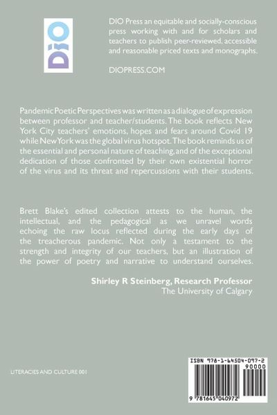 Pandemic Poetic Perspectives was written as a dialogue of expression between professor and teacher/students. The book reflects New York City teachers' emotions, hopes and fears around Covid 19 while New York was the global virus hotspot. The book reminds us of the essential and personal nature of teaching, and of the exceptional dedication of those confronted by their own existential horror of the virus and its threat and repercussions with their students. Brett Blake's edited collection attests to the human, the intellectual, and the pedagogical as we unravel words echoing the raw locus reflected during the early days of the treacherous pandemic. Not only a testament to the strength and integrity of our teachers, but an illustration of the power of poetry and narrative to understand ourselves.Shirley R Steinberg, Research ProfessorThe University of Calgary