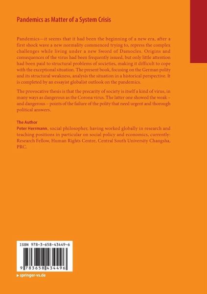 Pandemics - it seems that it had been the beginning of a new era, after a first shock wave a new normality commenced trying to, repress the complex challenges while living under a new Sword of Damocles. Origins and consequences of the virus had been frequently issued, but only little attention had been paid to structural problems of societies, making it difficult to cope with the exceptional situation. The present book, focusing on the German polity and its structural weakness, analysis the situation in a historical perspective. It is completed by an essayist globalist outlook on the pandemics.