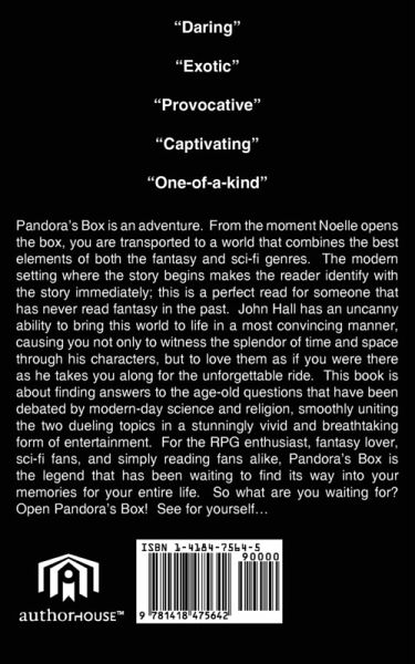 Pandora's Box is a fast-paced, action-packed, wonder-filled novel, urging the reader to travel deeper into its mystery until the very end. Remarkably told, written with such delicate grace and elegance, it will quickly find its way to your list of all-time favorites. Noelle is an ambitious twenty-two year old girl dreaming of doing something extraordinary. Refusing to believe that the next thirty years will consist of working the same monotonous job, she knows there must be something more to life. Approached through cyberspace by a mysterious and beautiful woman, Xenia, guardian of the Empress Aldana in the world of Xexyll Esuna, Noelle is called upon a mission that would save their world from utter annihilation from an opposing force known as the Yenzeti. Accepting the quest, she must abandon everything she has ever known, leaving her world behind. Failure would simultaneously end all life in the Universe, as would her refusal of the mission. Her journey will mark a remarkable quest in her soul's evolution as she learns the inner secrets of the Universe after finding the Trans-Dimensional Time-Space Warp Portal. This quest will change the fate of every existing world, as she unlocks the ancient mystery of life itself.