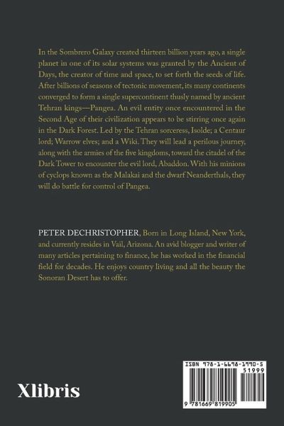 In the Sombrero Galaxy created thirteen billion years ago, a single planet in one of its solar systems was granted by the Ancient of Days, the creator of time and space, to set forth the seeds of life. After billions of seasons of tectonic movement, its many continents converged to form a single supercontinent thusly named by ancient Tehran kings-Pangea. An evil entity once encountered in the Second Age of their civilization appears to be stirring once again in the Dark Forest. Led by the Tehran sorceress, Isolde; a Centaur lord; Warrow elves; and a Wiki. They will lead a perilous journey, along with the armies of the five kingdoms, toward the citadel of the Dark Tower to encounter the evil lord, Abaddon. With his minions of cyclops known as the Malakai and the dwarf Neanderthals, they will do battle for control of Pangea.