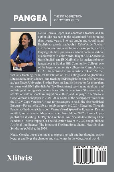 Neusa Correia Lopes is an educator, a teacher, and an author. She has been in the educational field for more than twenty years. She has taught and coordinated English at secondary schools in Cabo Verde. She has also been teaching other linguistics subjects, such as language studies, phonetics, and oral communication, at universities in Cabo Verde. Taught ABE (Academic Basic English) and ESOL (English for students of other languages) at Bunker Hill Community College, one of the largest community colleges in Massachusetts, USA. She lectured at universities in Cabo Verde, virtually teaching technical translation at Uni-Santiago and Anglophones Literature in other subjects, and teaching ESP English for Specific Purposes at Jean Piaget University. She has been an English instructor for more than ten years with ENB (English for New Bostonians) serving multicultural and multilingual immigrants coming from different countries. She wrote many articles on culture shock, immigration, culture, and language in A Naço, a Cape Verdean newspaper in 2007-2008. Some of the newspapers traveled in the TACV Cape Verdean Airlines for passengers to read. She also published Enigma--Portrait of a Life, an autobiography, in 2020 - Educating Through Pandemic-Traditional Classroom Versus Virtual Space-The Education Realm, in 2021, and an annual Magazine called Invisible in 2022. Correia Lopes published Educating Our Psycho-Emotional And Social State Through The Pandemic - Mask Impact On The Education Realm in 2022 and published Artificial Intelligence- The Impact of The Emotional Status. Heart Broken Syndrome published in 2024. Neusa Correia Lopes continues to express herself and her thoughts as she lectures and lives the changes and challenges in the educational world.