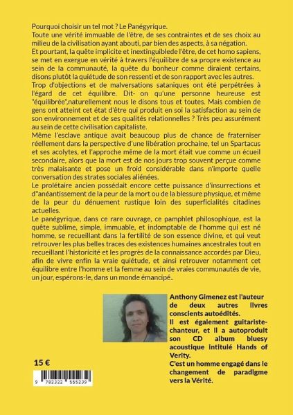 Pourquoi choisir un tel mot ? Le Panégyrique. Toute une vérité immuable de l'être, de ses contraintes et de ses choix au milieu de la civilisation ayant abouti, par bien des aspects, à sa négation. Et pourtant, la quête implicite et inextinguible de l'être, de cet homo sapiens, se met en exergue en vérité à travers l'équilibre de sa propre existence au sein de la communauté,la quête du bonheur comme diraient certains, disons plutôt la quiétude de son ressenti et de son rapport avec les autres. Trop d'objections et de malversations sataniques ont été perpétrées à l'égard de cet équilibre. Dit-on qu'une personne heureuse est "équilibrée",naturellement nous le disons tous et toutes. Mais combien de gens ont atteint cet état d'être qui produit en soi la satisfaction au sein de son environnement et de ses qualités relationnelles ? Très peu assurément au sein de cette civilisation capitaliste. Même l'esclave antique avait beaucoup plus de chance de fraterniser réellement dans la perspective d'une libération prochaine, tel un Spartacus et ses acolytes, et l'approche même de la mort était vue comme un écueil secondaire, alors que la mort est de nos jours trop souvent perçue comme très malaisante et pose un froid considérable dans n'importe quelle conversation des strates sociales aliénées. Le prolétaire ancien possédait encore cette puissance d'insurrections et d"anéantissement de la peur de la mort ou de la blessure physique, et même de la peur du dénuement rustique loin des superficialités citadines actuelles. Le panégyrique, dans ce rare ouvrage, ce pamphlet philosophique, est la quête sublime, simple, immuable, et indomptable de l'homme qui est né homme, se recueillant dans la fertilité de son essence divine, et qui veut retrouver les plus belles traces des existences humaines ancestrales tout en recueillant l'historicité et les progrès de la connaissance accordés par Dieu, afin de vivre enfin la vraie quiétude, et retrouver notamment cet équilibre entre l'homme et la femme au sein de vraies communautés de vie, un jour, espérons-le, dans un monde émancipé..