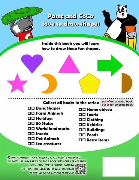 This book is a simple book to show young children how to draw shapes. My goal is to utilize my 40 plus years of art experience to guide and inspire new artists. www.linktr.ee/PanicAndCoCo