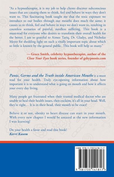 Panic, Germs and the Truth inside American Mouths skillfully and eloquently guides us to the understanding that our lifestyle choices play major roles in determining our overall health and function- especially the choices we make regarding our mouth- the gateway to our whole body. This book is a revelation for anyone with a diagnosed, misdiagnosed or even misdiagnosed disorder wanting answers about why they make be sick and why they might not be getting better. It's an empowering message for those who want to maintain health and resistance to disease. Panic, Germs and the Truth inside American Mouths is the book millions of Americans have been waiting for.