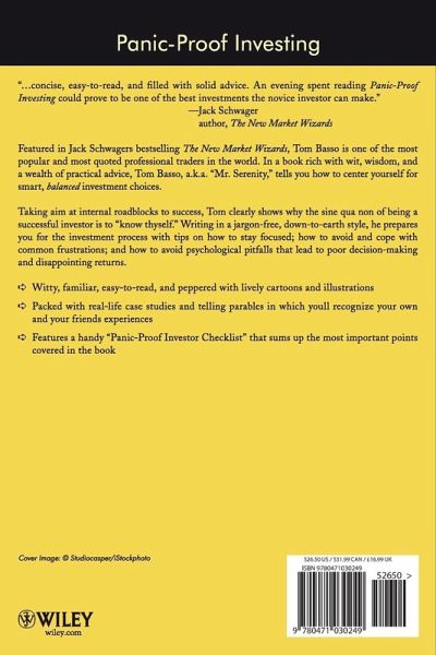 "...concise, easy-to-read, and filled with solid advice. An evening spent reading Panic-Proof Investing could prove to be one of the best investments the novice investor can make." --Jack Schwager author, The New Market Wizards Featured in Jack Schwager's bestselling The New Market Wizards, Tom Basso is one of the most popular and most quoted professional traders in the world. In a book rich with wit, wisdom, and a wealth of practical advice, Tom Basso, a.k.a. "Mr. Serenity," tells you how to center yourself for smart, balanced investment choices. Taking aim at internal roadblocks to success, Tom clearly shows why the sine qua non of being a successful investor is to "know thyself." Writing in a jargon-free, down-to-earth style, he prepares you for the investment process with tips on how to stay focused; how to avoid and cope with common frustrations; and how to avoid psychological pitfalls that lead to poor decision-making and disappointing returns. * Witty, familiar, easy-to-read, and peppered with lively cartoons and illustrations * Packed with real-life case studies and telling parables in which you'll recognize your own and your friends' experiences * Features a handy "Panic-Proof Investor Checklist" that sums up the most important points covered in the book