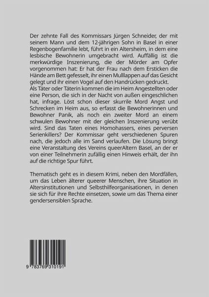 Kommissar Jürgen Schneider, der mit seinem Mann und dem 12-.jährigen Sohn in Basel in einer Regenbogenfamilie lebt, hat in einem Altersheim den Mord einer lesbischen Bewohnerin aufzuklären. Auffällig ist eine merkwürdige Inszenierung, die der Mörder am Opfer vorgenommen hat: er hat der Frau nach dem Ersticken die Hände am Bett gefesselt, ihr einen Mulllappen auf das Gesicht gelegt und ihr einen Vogel auf den Handrücken gedruckt. Als Täter oder Täterin kommen die im Heim Angestellten oder eine Person, die sich in der Nacht von aussen eingeschlichen hat, infrage. Löst schon dieser skurrile Mord Angst und Schrecken im Heim aus, so erfasst die Bewohnerinnen und Bewohner Panik, als noch ein zweiter Mord an einem schwulen Bewohner mit der gleichen Inszenierung verübt wird. Sind das Taten eines Homohassers, eines perversen Serienkillers? Der Kommissar geht verschiedenen Spuren nach, die jedoch alle im Sand verlaufen. Die Lösung bringt eine Veranstaltung des Vereins queerAltern Basel, an der er von einer Teilnehmerin zufällig einen Hinweis erhält, der ihn auf die richtige Spur führt. Thematisch geht es in diesem Krimi, neben den Mordfällen, um das Leben älterer queerer Menschen, ihre Situation in Altersinstitutionen und um Selbsthilfeorganisationen, in denen sie sich für ihre Rechte einsetzen, sowie um eine gendersensible Sprache.