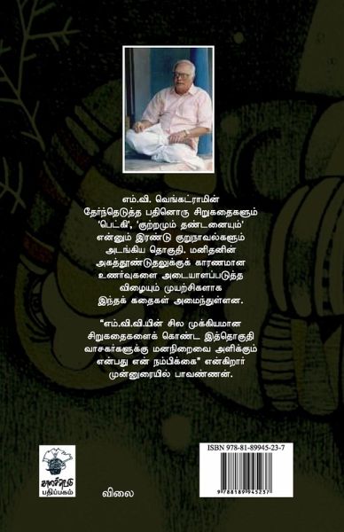 A collection of eleven selected short stories and two novellas by acclaimed writer M.V. Venkatram (1920-2000). M.V. Venkatram was a prolific writer who wrote seven novels and many short stories, his novel Kaathukal(Ears) won him the Sahitya Akademi award in 1993. In these stories, he attempts to identify the basic insticts of man. Writer Paavannan in his introduction praises these as some of the important stories M.V. Venkatram wrote.