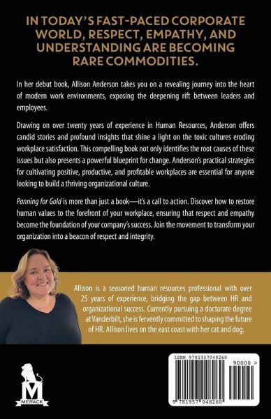 In today's fast-paced corporate world, respect, empathy, and understanding are becoming rare commodities. In her debut book, Allison Anderson takes you on a revealing journey into the heart of modern work environments, exposing the deepening rift between leaders and employees. Drawing on over twenty years of experience in Human Resources, Anderson offers candid stories and profound insights that shine a light on the toxic cultures eroding workplace satisfaction. This compelling book not only identifies the root causes of these issues but also presents a powerful blueprint for change. Anderson's practical strategies for cultivating positive, productive, and profitable workplaces are essential for anyone looking to build a thriving organizational culture. Panning for Gold is more than just a book-it's a call to action. Discover how to restore human values to the forefront of your workplace, ensuring that respect and empathy become the foundation of your company's success. Join the movement to transform your organization into a beacon of respect and integrity.