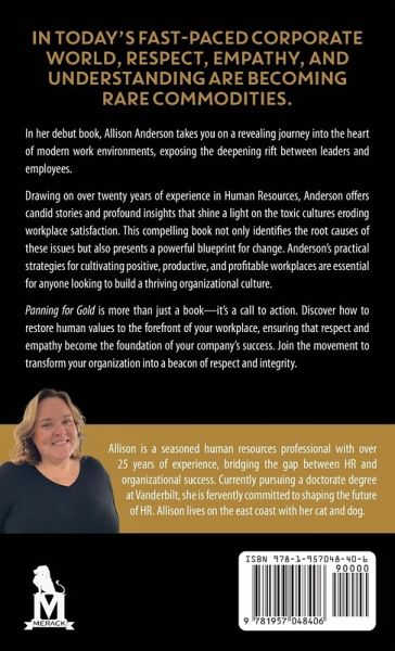 In today's fast-paced corporate world, respect, empathy, and understanding are becoming rare commodities. In her debut book, Allison Anderson takes you on a revealing journey into the heart of modern work environments, exposing the deepening rift between leaders and employees. Drawing on over twenty years of experience in Human Resources, Anderson offers candid stories and profound insights that shine a light on the toxic cultures eroding workplace satisfaction. This compelling book not only identifies the root causes of these issues but also presents a powerful blueprint for change. Anderson's practical strategies for cultivating positive, productive, and profitable workplaces are essential for anyone looking to build a thriving organizational culture. Panning for Gold is more than just a book-it's a call to action. Discover how to restore human values to the forefront of your workplace, ensuring that respect and empathy become the foundation of your company's success. Join the movement to transform your organization into a beacon of respect and integrity.