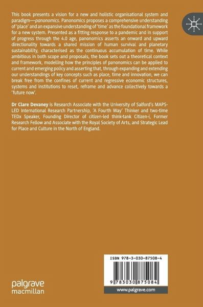 This book presents a vision for a new and holistic organisational system and paradigm-panonomics. Panonomics proposes a comprehensive understanding of 'place' and an expansive understanding of 'time' as the foundational framework for a new system. Presented as a fitting response to a pandemic and in support of progress through the 4.0 age, panonomics asserts an onward and upward directionality towards a shared mission of human survival and planetary sustainability, characterised as the continuous accumulation of time. While ambitious in both scope and proposals, the book sets out a theoretical context and framework, modelling how the principles of panonomics can be applied to current and emerging policy and asserting that, through expanding and extending our understandings of key concepts such as place, time and innovation, we can break free from the confines of current and regressive economic structures, systems and institutions to reset, reframe and advance collectively towards a 'future now'.